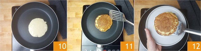 Cocina el pancake por un lado a fuego bajo, hasta que aparezcan las primeras burbujas en la superficie 10. Da la vuelta al pancake con una espátula y termina de cocinarlo un minuto por el otro lado 11. Continúa de esta manera hasta terminar la masa. Los pancakes salados están listos 12.