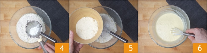 Incorpora también la levadura tamizada 4 y el queso rallado 5. Remueve hasta obtener una masa lisa y homogénea 6.