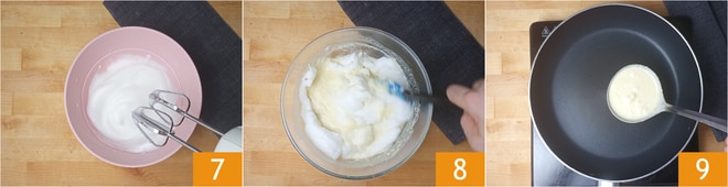Monta las claras a punto de nieve firme con las varillas eléctricas 7, luego incorpóralas a la mezcla de yemas poco a poco, realizando un movimiento delicado de abajo hacia arriba 8. Engrasa ligeramente una sartén antiadherente. Vierte un cazo de masa no lleno 9.