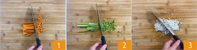 Para preparar el pancotto con judías, ponlas en remojo según las indicaciones del paquete, generalmente 8-10 horas en agua fría, con un lavado final. Para el sofrito, corta el ajo en rodajas finas, quita las semillas del chile y córtalo en rodajas finas. Limpia y corta en dados de 2-3 mm la zanahoria 1 y el apio 2, pela y pica finamente la cebolla 3.