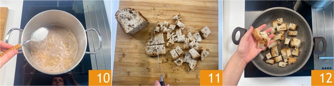 Sazona con una buena pizca de sal, mezcla y deja a un lado, al calor 10. Luego toma el pan y córtalo en cubos de aproximadamente 2-2,5 cm 11 e introdúcelo en una olla más amplia y baja 12.