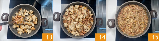 Añade la "sopa" de judías hasta cubrir el pan 13 14, si es necesario puedes añadir más agua. Cocina otros 15 minutos, removiendo de vez en cuando, para desmenuzar y ablandar bien el pan 15.