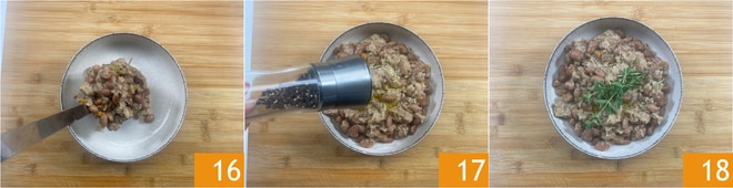 Deja el pancotto de judías ligeramente caldoso porque tenderá a espesarse rápidamente. Sirve 16 añadiendo un chorro de aceite en crudo, pimienta 17 y hierbas aromáticas al gusto 18!