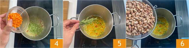 En una olla alta, vierte un buen chorro de aceite, añade el ajo y el chile para sofreírlos a fuego moderado. Luego, añade el apio, la zanahoria 4 y la cebolla y mezcla. Cocina durante unos 10 minutos, removiendo a menudo. Añade también el romero 5 y luego vierte las judías 6.