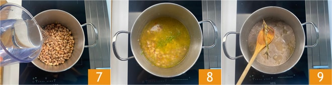 Cubre con agua (aproximadamente 1,5 l) 7 8, añadiendo el resto si es necesario. Espera a que hierva por primera vez, luego cocina durante aproximadamente 1 hora y 30 minutos con la tapa: dependerá también del tipo de judías utilizadas; al final deben estar tiernas pero consistentes. Luego puedes quitar el romero 9.