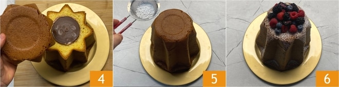 Cubre el pandoro con la tapa 4, luego espolvorea la superficie con azúcar glas 5 y decora con los frutos del bosque 6. Deja el pandoro relleno de NUTELLA helado a temperatura ambiente durante unos 10 minutos antes de servirlo y cortarlo.