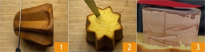 Para preparar el pandoro relleno de NUTELLA Helado, primero corta la parte superior del pandoro a unos 3-4 cm de altura 1. Con la hoja de un cuchillo largo de sierra, ahueca el interior del pandoro para crear un hueco aproximadamente del mismo tamaño que la tarrina de NUTELLA Helado 2. Transfiere el pandoro al plato de servir, luego quita el papel del helado e introdúcelo en el hueco 3.