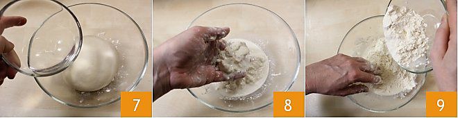amasa todo, como hiciste antes 10. Pon también la segunda masa a leudar durante al menos 3 horas en un bol, cubierto con film, en el horno apagado con luz encendida 11. Cuando también la segunda masa haya leudado 12 podrás pasar a la realización de la masa final.
