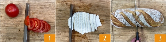 Para preparar el pan cunzato, primero calienta la barra de pan fresco en un horno estático precalentado a 200° durante unos diez minutos. Lava y corta los tomates en rodajas de aproximadamente 0,5 cm de grosor 1, luego corta también el queso primo sale 2. Saca la barra de pan del horno y divídela en 2 partes 3.