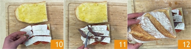 Finalmente, perfuma con el orégano seco 10 y añade los filetes de anchoa 11. Cierra con la otra mitad del pan 12 y repite el mismo procedimiento para preparar el segundo bocadillo. ¡Tu pan cunzato está listo para ser disfrutado!