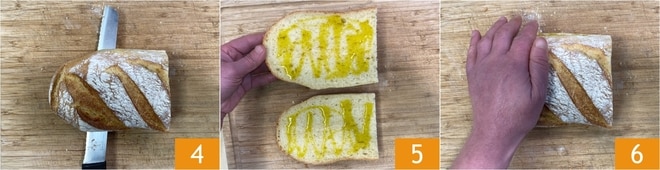 Corta cada parte a la mitad en sentido horizontal 4 y condimenta con abundante aceite 5, luego presiona las 2 mitades juntas para distribuir el aceite de manera uniforme 6.