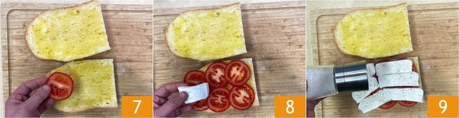 Coloca las rodajas de tomate en la base del bocadillo 7, luego cubre con las rodajas de primo sale 8. Sala 9 y pimienta.