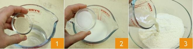 Para preparar el pan de Papá Noel, empezad disolviendo la levadura junto con el agua tibia 1, mientras que en la leche tibia añadís el azúcar 2 y la sal y mezcláis para amalgamar los ingredientes. Tomad un bol grande y verted la harina tamizada, luego añadid primero el agua en la que habéis disuelto la levadura 3,