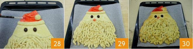 Con un pincelito coloread de rojo el sombrero 28 y la nariz 29 luego coced el pan de Papá Noel en horno estático precalentado a 180° durante 35 minutos (si es ventilado a 160° durante unos 25-30 minutos). Cuando esté cocido, sacadlo del horno 30, dejadlo templar y disfrutadlo para celebrar la Navidad!