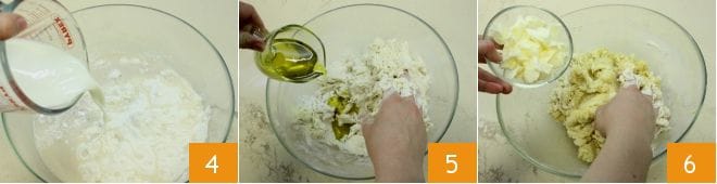 luego verted también la leche con azúcar y sal 4. Entonces empezad a amasar y poco a poco verted también el aceite de oliva 5 en hilo. Cuando el aceite esté incorporado, verted también la mantequilla ablandada en trocitos 6 poco a poco, agregando más cuando el anterior esté incorporado.