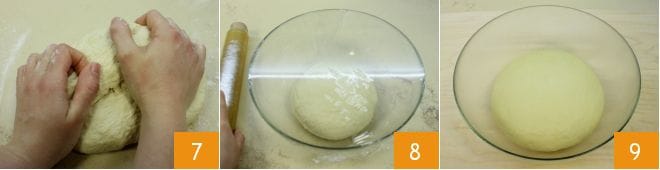 Amasad todo en el bol, luego trasladad la masa a una superficie ligeramente enharinada. Manipuladla enérgicamente 7 hasta obtener una masa suave, homogénea y lisa. Formad una bola, ponedla en un bol, cubridla con film transparente 8 y dejadla reposar a temperatura ambiente durante un par de horas (o hasta que haya duplicado su volumen) 9.