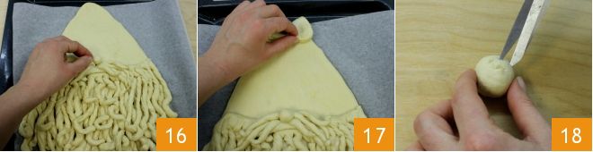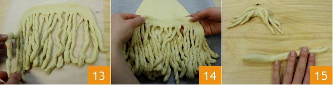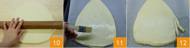 Pasado el tiempo necesario retomad la masa, divididla en dos partes, una de unos 900 gr y la otra de 450 gr. Extendéd la más grande 10 dándole forma de triángulo de 36 cm de altura, con la punta ancha de unos 6 cm y la base de 23 cm, con esquinas redondeadas que representan la cabeza y el sombrero de Papá Noel. Extendéd el triángulo de masa sobre una bandeja cubierta con papel de horno y pincelad con agua 11. Luego, con el cortapasta haced tiras de aproximadamente 1 cm de grosor, a lo largo de toda la base del triángulo 12.