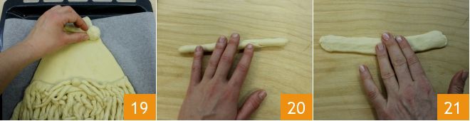 Colocad el pompón 19 y luego dedicaos a la base del sombrero con la masa restante, haciendo un cilindro 20 para aplastarlo ligeramente 21.
