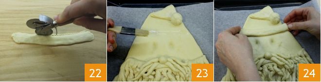 Terminad el borde con un cortapasta dentado 22, pincelad la frente de Papá Noel con agua 23 y colocad la base del sombrero 24.