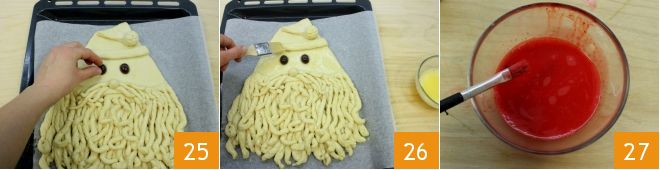 Creed los ojos con dos aceitunas negras 25 y pincelad todo el pan de Papá Noel con un huevo batido 26. En el huevo batido que sobra, verted unas gotas de colorante rojo hasta obtener la coloración deseada 27.