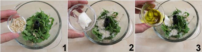 Para preparar las spianatine con tomatito relleno de queso y rúcula, empieza por la crema de rúcula: coloca la rúcula bien lavada en un procesador junto con los piñones 1, el grana y el queso de cabra 2 y el aceite de oliva 3.