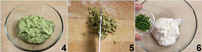 Acciona las cuchillas hasta obtener una crema lisa y bien amalgamada 4. Pasa ahora a la crema de queso: pica las aceitunas 5 y el cebollino. En un bol pequeño coloca el queso de cabra, el cebollino picado 6,