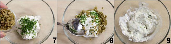 las aceitunas verdes picadas 7, sal y pimienta y mezcla la crema con la ayuda de una cuchara (8-9).