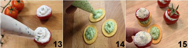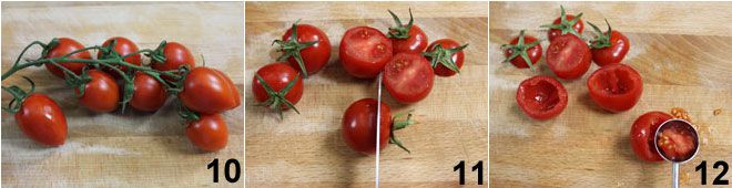 Quita los tomatitos del racimo y lávalos 10. Corta la parte superior del pedúnculo, guardándola para usarla como decoración, y vacía el interior con la ayuda de un sacabolas 12.