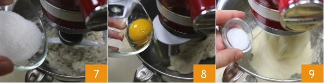 añade después el azúcar 7, el huevo 8, la cáscara de naranja, la sal 9.