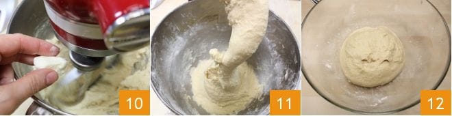 Cuando los ingredientes estén amalgamados, sustituye el accesorio por el gancho y añade por último la mantequilla en trozos suavizada, poco a poco 10, espera que se haya absorbido la anterior antes de añadir la siguiente. En este punto, continúa amasando 11 y cuando la masa esté lisa y se despegue de las paredes del bol, extráela, forma una bola y colócala en un bol 12, cubre con film transparente y deja fermentar en el horno apagado con la luz encendida durante una hora y media.