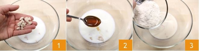 Para realizar los panetoncitos de chocolate comienza con la preparación del pre-fermento: coloca la leche tibia en un bol grande, disuelve dentro la levadura fresca (alternativamente puedes usar 2 g de levadura seca) 1, añade la cucharadita de malta (o de azúcar) 2 y luego incorpora la harina tamizada 3. Mezcla con una batidora para amalgamar los ingredientes, hasta obtener una mezcla lisa y sin grumos,