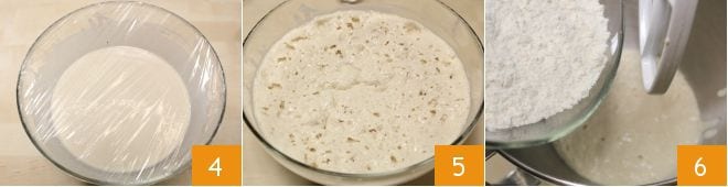 cúbrelo con film transparente 4 y déjalo fermentar en el horno apagado con la luz encendida durante 40 minutos hasta que duplique su volumen 5. Mientras tanto, coloca las gotas de chocolate en el congelador, de esta manera no se derretirán cuando las incorpores a la masa y no se deslizarán al fondo de los panetoncitos. Transcurrido el tiempo de fermentación, coloca el pre-fermento en una batidora equipada con accesorio K, añade la harina 6, la miel,