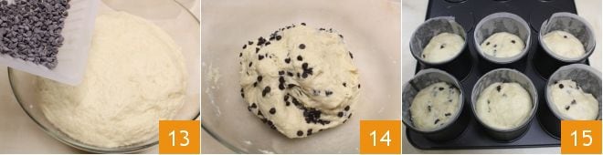 Transcurrido el tiempo de reposo, retoma la masa, trabájala rápidamente y añade las gotas de chocolate (13-14), divídela en 6 bolitas iguales. Engrasa y forra con papel de horno 6 moldes de 8 cm de diámetro y 7 cm de altura. Coloca cada bolita de masa en un molde, pincela la superficie con nata y déjalos fermentar nuevamente 15 hasta que la masa alcance el borde, tomará al menos una hora.