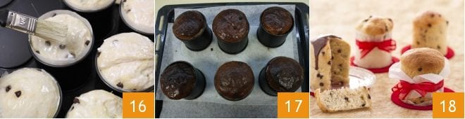 En este punto, pincela nuevamente la superficie con huevo batido 16 u otra nata para dorar la superficie. Hornea en horno estático a 180° durante 20 minutos hasta que la parte superior esté dorada 17. Una vez cocidos, saca los panetoncitos con gotas de chocolate del horno y déjalos enfriar. Tus panetoncitos están listos para ser disfrutados así 18, o acompañarlos con una salsa de chocolate.