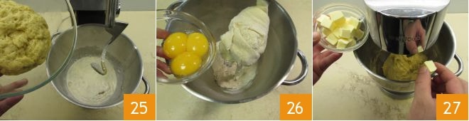 luego la masa fermentada 25 y pongan en marcha el robot durante 2 minutos a velocidad media. Con el gancho aún en funcionamiento, agreguen las yemas y continúen trabajando hasta que estén completamente incorporadas 26. Finalmente, agreguen la mantequilla en pequeños trozos a la vez 27, siempre a temperatura ambiente