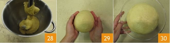 y trabajen durante unos 5-6 minutos. La masa está lista tan pronto como se amase y esté suave y elástica 28. Boleen nuevamente la masa 29 y transfieran a un bol. Cubran con film transparente y dejen reposar en el horno apagado con una cacerola de agua caliente durante una hora 30.