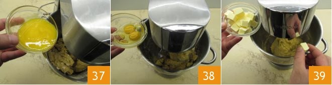 Pongan en marcha el robot durante 3-4 minutos a velocidad media y luego agreguen las yemas 37 y luego los huevos 38, continúen mezclando hasta que se absorban por completo. Tomará unos instantes para que se amalgamen con el resto de la masa. Luego viertan la mantequilla a temperatura ambiente cortada en trozos y déjenla incorporar bien 39,