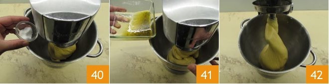 sazonen con la sal 40 y finalmente con el aroma panettone, tomará unos minutos antes de que se incorpore adecuadamente 41. La masa está lista tan pronto como esté suave y lisa y se haya amaseado al gancho 42.