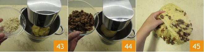 Pueden agregar las almendras picadas 43 y los higos bien escurridos 44. Dejen trabajar la máquina durante 3 minutos antes de desenganchar el gancho y trasladarse a la superficie de trabajo donde trabajarán la mezcla durante unos instantes a mano: no es necesario engrasar la superficie porque la masa soltará mucho grasa 45.