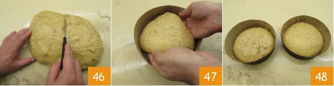 Dividan la masa en dos trozos de aproximadamente 1150 g cada uno 46. Como antes, boleen ambos y luego transfieran a los moldes de cartón anchos y bajos para panettones de 1 kg 47. Déjenlos fermentar durante 3 horas en el horno apagado con un cazo de agua hirviendo 48.