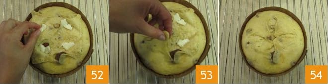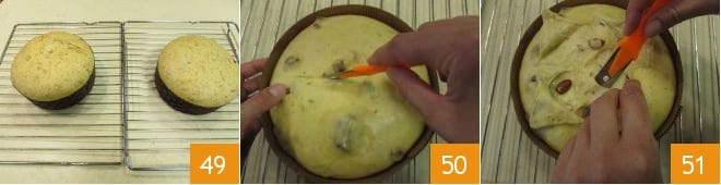 Transcurrido el tiempo necesario para que los panettones fermenten 49 recójanlos y déjenlos durante 10 minutos al aire. Trasládenlos a la rejilla y corten la superficie utilizando una cuchilla formando una cruz 50. Abran bien los lados con el cortador mientras mantienen levantados los bordes 51.