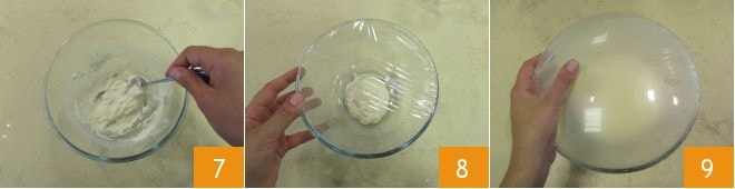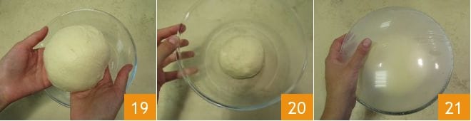 Boleen la masa con las manos, es decir, denle una forma esférica juntando las partes inferiores hacia el centro 19. Coloquen la bola en un bol 20 y cubran con film transparente. Pongan el bol en el horno apagado con un cazo de agua hirviendo durante una hora 21.