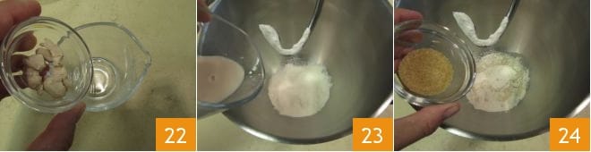 Tan pronto como la masa haya duplicado su tamaño, pueden pasar a la segunda masa. Disuelvan nuevamente la levadura en agua a temperatura ambiente y viértanla en la batidora, aún equipada con gancho, y en la que ya han vertido la harina 23. Agreguen el azúcar 24,