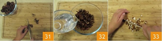Es el momento de ocuparse de la tercera y última masa. Piquen los higos secos 31 y viértanlos en un bol, cúbranlos con agua a temperatura ambiente y déjenlos en remojo 32, luego piquen groseramente las almendras con un cuchillo 33.