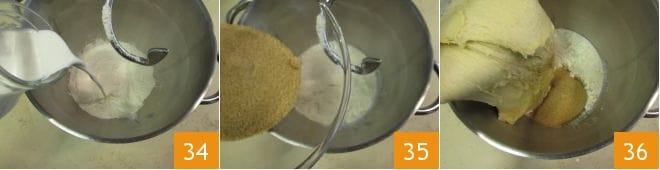 Ahora que tienen todo lo que necesitan, pongan la harina y la nata a temperatura ambiente en la batidora con gancho 34, agreguen el azúcar 35 y luego la masa fermentada 36.