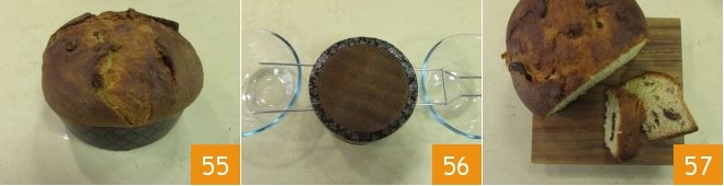 Sus panettones están listos para el horneado: hornéenlos en el horno previamente calentado a 190°, en modo estático, durante unos 75 minutos. Para evitar que la superficie del dulce se queme, coloquen otra bandeja de horno en la rejilla más alta, de esta manera evitarán que las resistencias oscurezcan el sombrero de los panettones 55. Para asegurarse de que los panettones estén cocidos, utilicen un termómetro de cocina y asegúrense de que en el centro hayan alcanzado los 92°. Una vez que los saquen del horno, pinchen con unos pinchos 56 y déjenlos boca abajo durante toda la noche 56. ¡Aquí están listos sus panettones con frutos secos, solo les queda cortarlos y disfrutarlos 57!