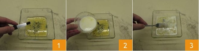 Para preparar el panettone con higos y almendras, comiencen con el aroma: en un bol viertan la miel, deshojen el tomillo y perfumen luego con las semillas de la vaina de vainilla extraídas con un cuchillito 1, viertan la mantequilla derretida aún caliente 2 finalmente mezclen bien todo con un tenedor 3.