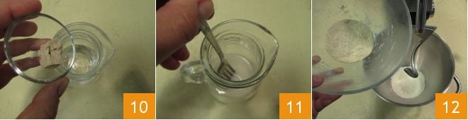 Al día siguiente, viertan la levadura en una jarra con agua a temperatura ambiente 10, disuélvanla ayudándose con un tenedor 11 y comiencen la masa. En una batidora equipada con gancho, viertan la harina, el prefermento 12,