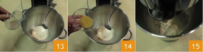 luego el agua con la levadura 13, el azúcar 14 y pongan en marcha el gancho durante 1 minuto a velocidad media 15.