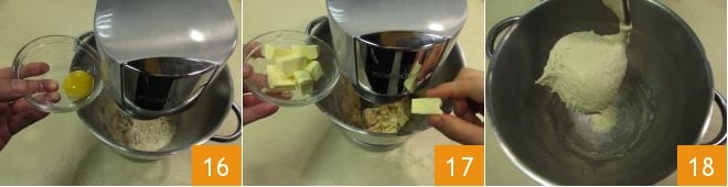 Con el gancho siempre en funcionamiento, agreguen la yema y trabajen durante 1 minuto más 16. Después de eso, incorporen la mantequilla un trozo a la vez y trabajen durante 5-8 minutos o hasta que la masa esté suave y compacta 17. Además, deberá amasarse, es decir, literalmente adherirse al gancho 18.